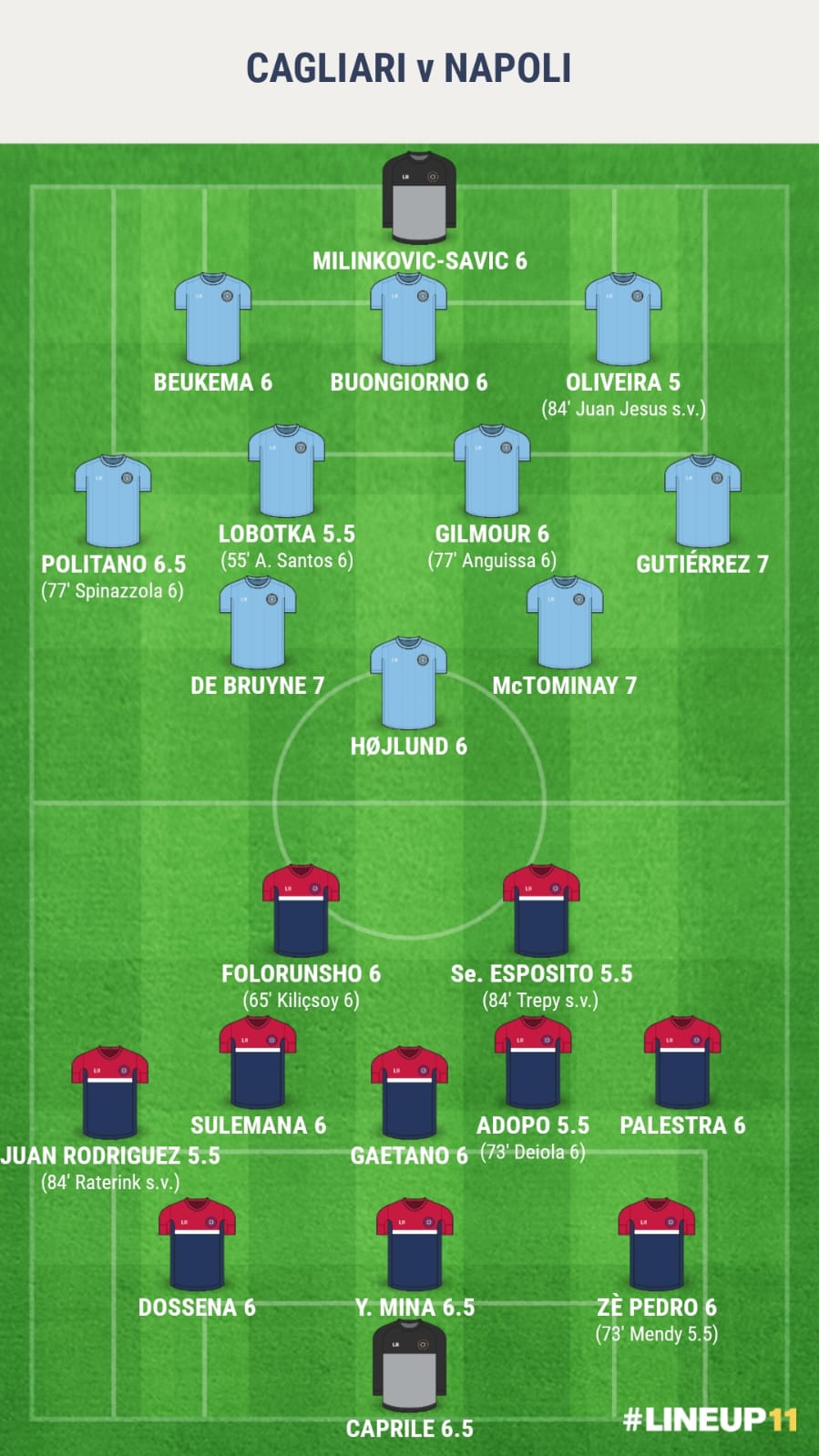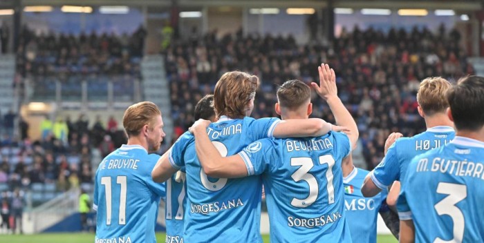 La gara si sblocca al 2′: McTominay esce vincitore da un mischione sul secondo palo dagli sviluppi di corner, per siglare lo 0-1. La reazione dei Casteddu è tutta in un tiro largo di Seba Esposito su un recupero alto sfruttando un errore di Oliveira. All’alba della ripresa, il Napoli si infrange due volte su Caprile: prima con una conclusione al limite di De Bruyne, poi King Kev manda in porta Politano. Il Cagliari non riesce a costruire azioni manovrate, perciò prova a sfruttare i calci piazzati: sia Gaetano che Seba Esposito provano a ribadire verso la porta, ma non centrano lo specchio difeso da Milinković-Savić.