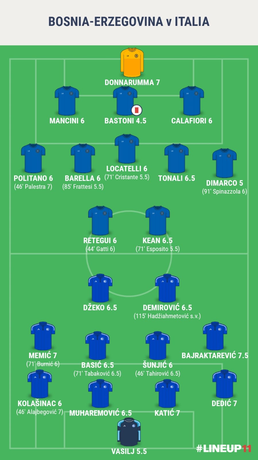 Esposito 5.5: Nonostante la gara richieda caratteristiche che non gli appartengono, riesce a mettere in difficoltà la difesa bosniaca grazie all’asse GenZ creato con Palestra: prima tira alto, poi trova Vasilj. Il primo rigore della lotteria azzurra è il più pesante di tutta la sua giovane carriera: lo sbaglia. Ha ancora tante sfide e tanti rigori da calciare. Magari in azzurro. Magari ancora più pesanti. Nessuno tocchi Pio.
