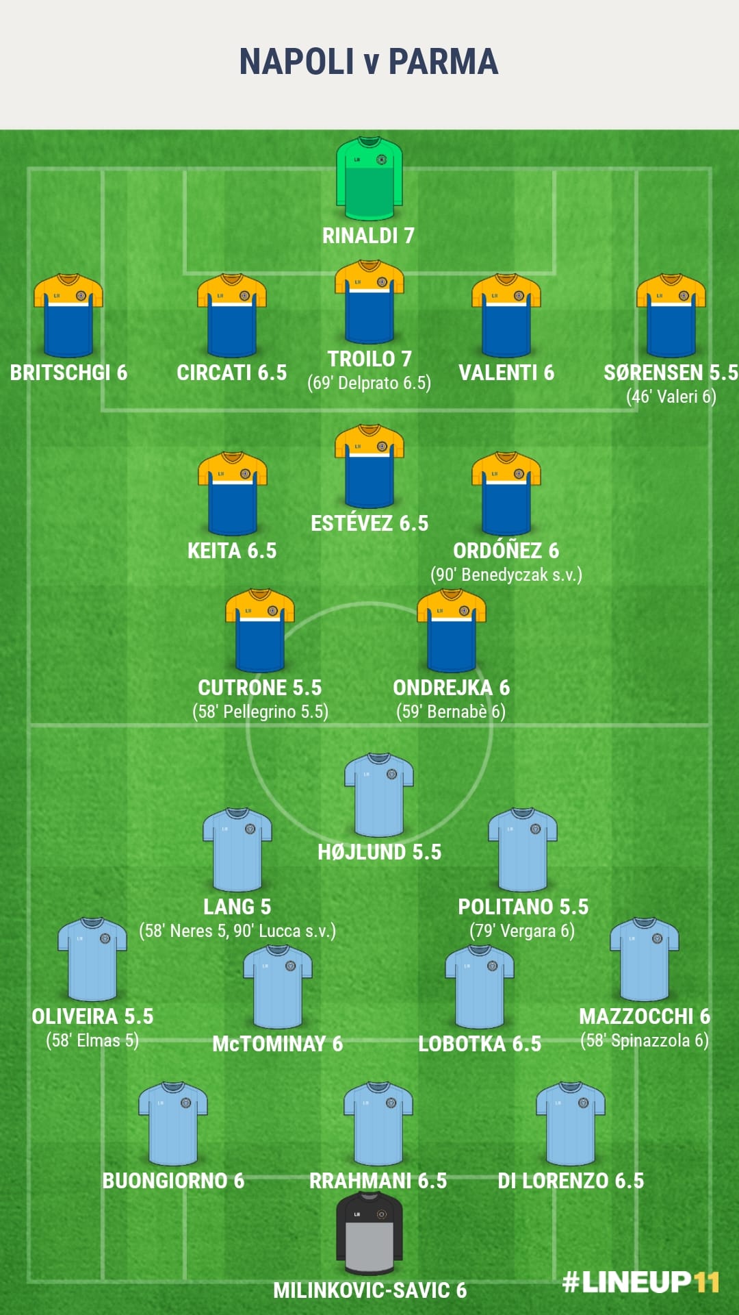 Estévez 6.5: Si piazza davanti all’area di rigore a protezione del bunker dei crociati per schermare i passaggi diretti e le imbucate per Højlund. In fase offensiva… quale fase offensiva?Cuesta 6, ma anche 4: Arriva a Parma il figlioccio di Arteta, il discepolo indiretto del guardiolismo, il portatore del nuovo calcio. Poi arriva al Maradona con un 5-3-2 buttando via la metà campo offensiva utile solo al palleggio per fare scorrere secondi. Il punto di ritorno dal D.A.M., gli dà ragione. Ma se Cuesta è la strada per il futuro, #iorestoacasa.