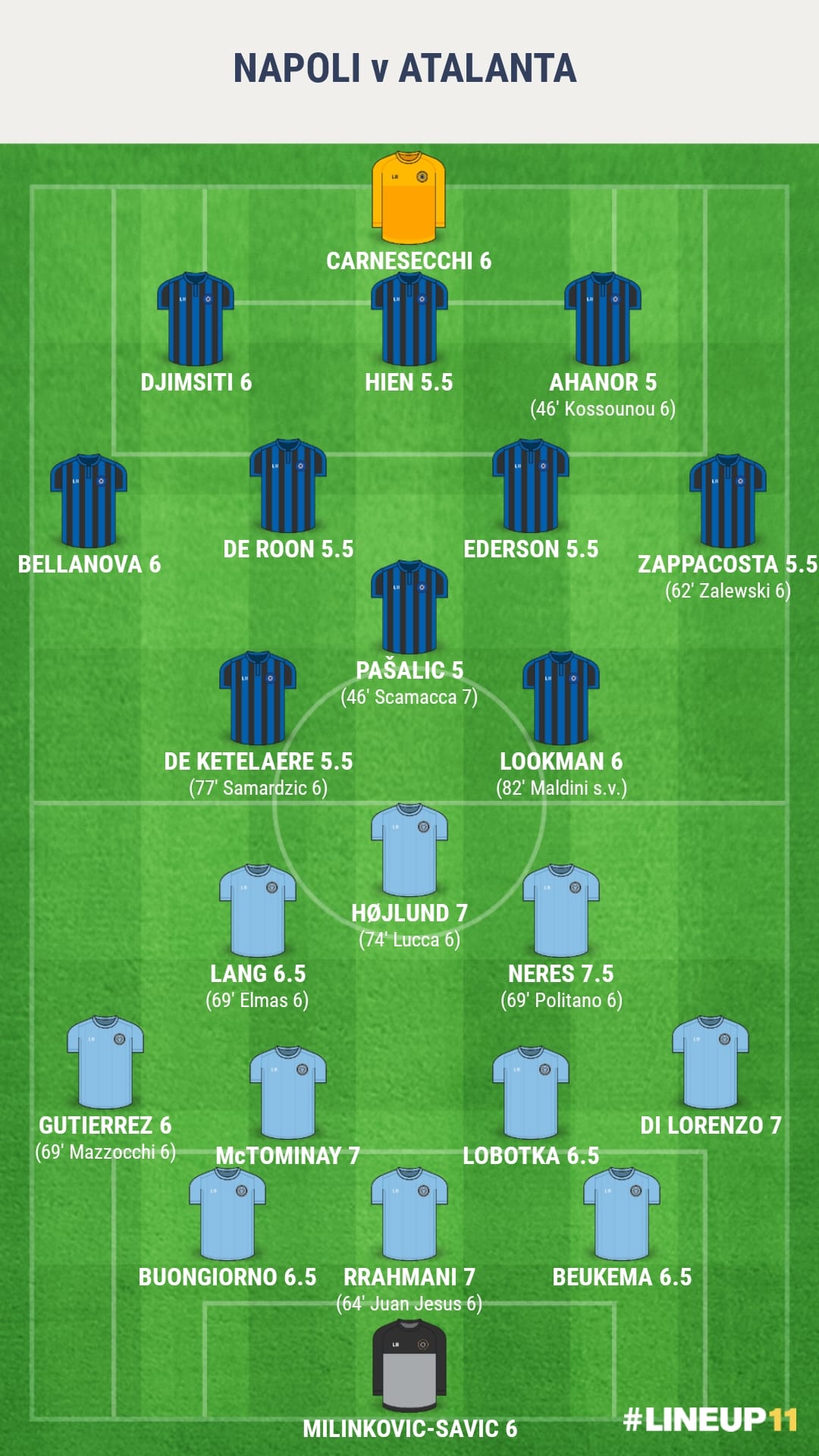 Lookman 6: Non è al massimo della forma e si vede, ma quando ne punta 3, e fa scomparire il pallone agli occhi di Lobotka, la temperatura si alza. Aura! Scamacca 7: Dà vita ad un secondo tempo che si prospettava piatto, con la rete del 3-1. Fa quello che Pašalićnon era riuscito a fare: rompere la linea difensiva del Napoli. Rrahmani non glielo concede, Buongiorno sì.