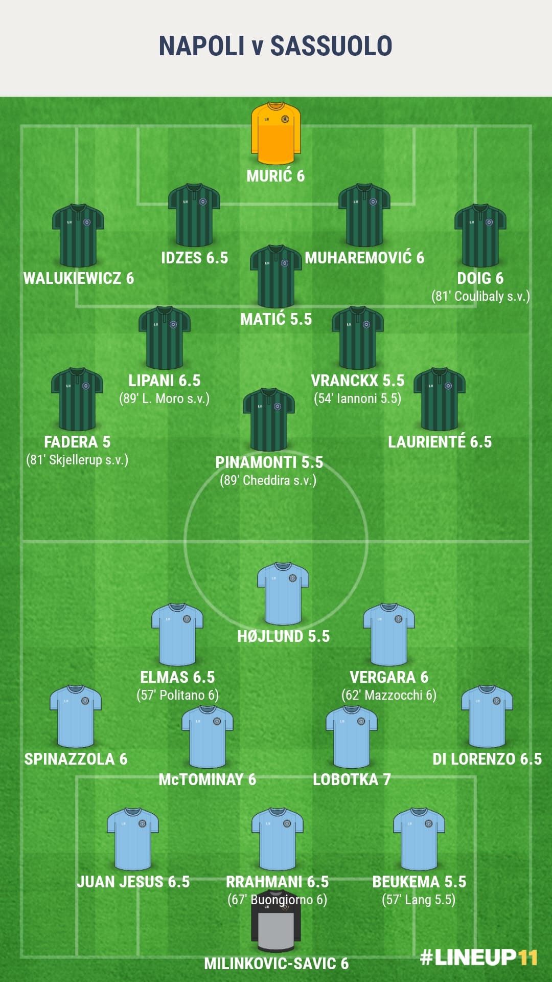 Laurienté 6.5: Necessariamente il migliore dei suoi e fondamentale nell’economia neutra della gara: rappresenta l’unico dei 22 ad alzare un po’ i giri del motore. La maggior parte delle azioni sassolese arrivano dai suoi piedi. Fast forward.