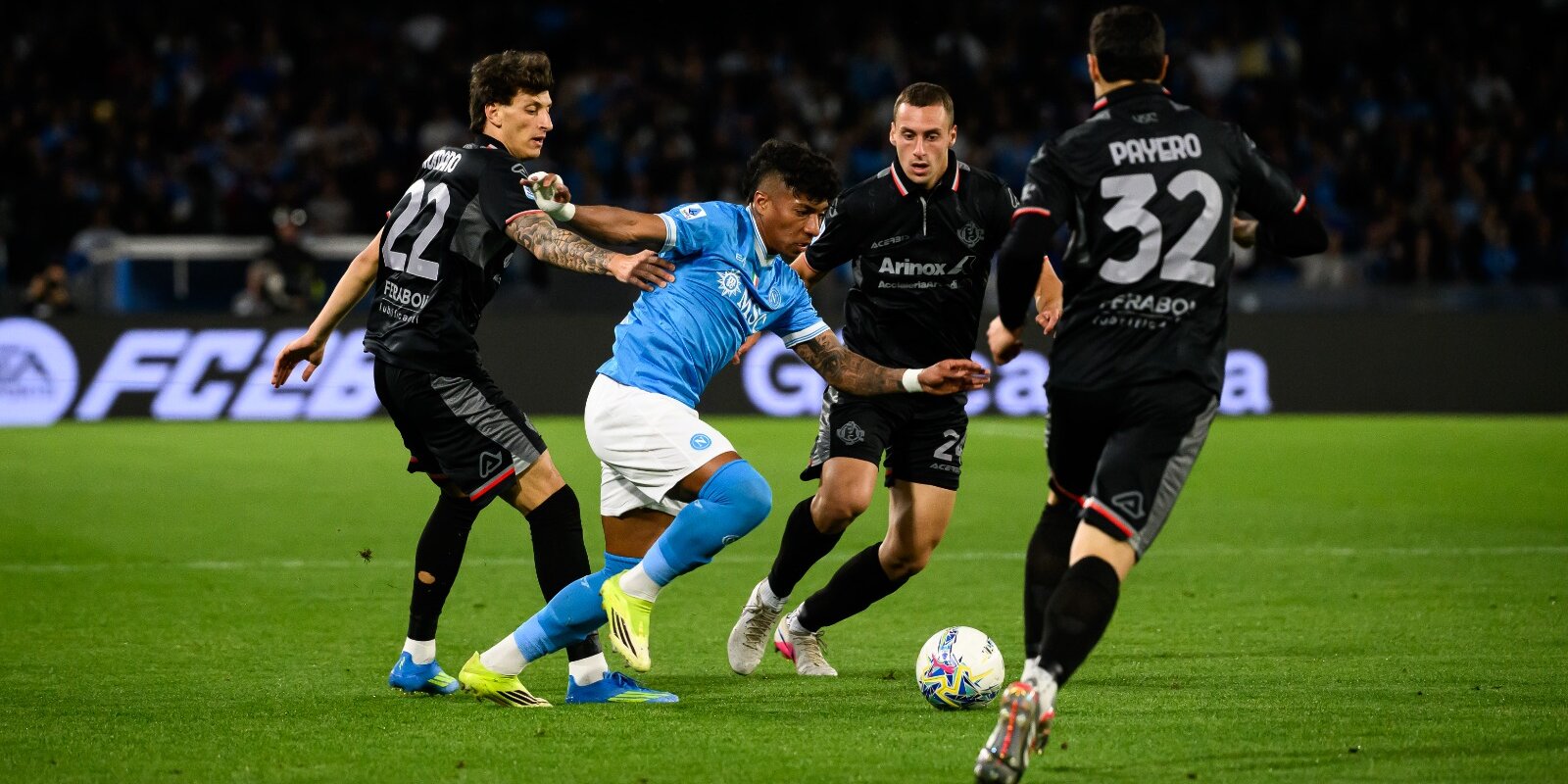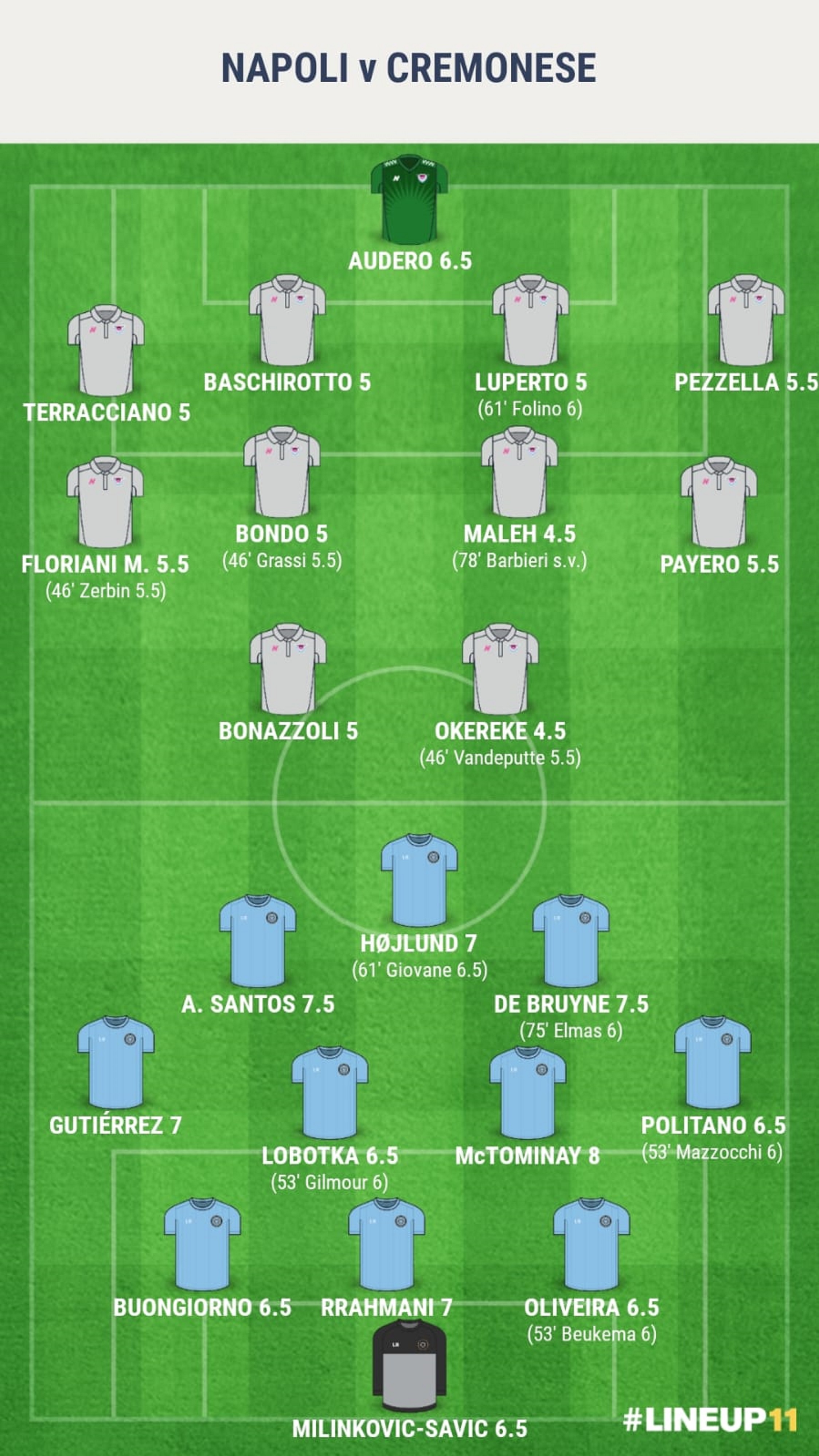 1Dopo un solo minuto di gioco, Højlund apre e chiude l’azione: è il primo segnale di un Napoli famelico. Poco dopo, McTominay porta gli azzurri in vantaggio con un tiro dal limite dell’area. Lo scozzese tenta il gol in fotocopia dopo una trentina di minuti di pura gestione azzurra. Højlund sfiora il golazo in solitaria, poi, con un movimento simile trova il 2-0, con la fondamentale deviazione di Terracciano. Prima dell’intervallo, i partenopei calano il tris: De Bruyne punisce un errore in uscita di Maleh. All’alba della ripresa: Milinković-Savić innesca Alisson Santos nella propria metà campo, Højlund gli libera strada portando via l’uomo: il brasiliano trova il 4-0. Provano Alisson e Gilmour ad incrementare il bottino dal limite, mentre Rrahmani si ferma solo davanti alla traversa di testa. L’ultima chance è per McTominay dal dischetto: Audero para un rigore non irresistibile.