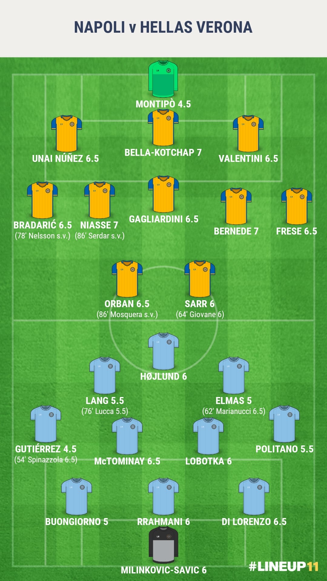 Marianucci 6.5: Crea una commistione di sensazioni sin dall’ingresso: sgomento e rassegnazione. Ai primi tocchi, ansia e voglia di dimostrare. Trova l’assist per Di Lorenzo con semplicità e naturalezza. Luca è insieme lo yin e lo yang. Dà le vibes di Albiol e di Cribari. Ma è così che nascono le grandi storie d’amore.