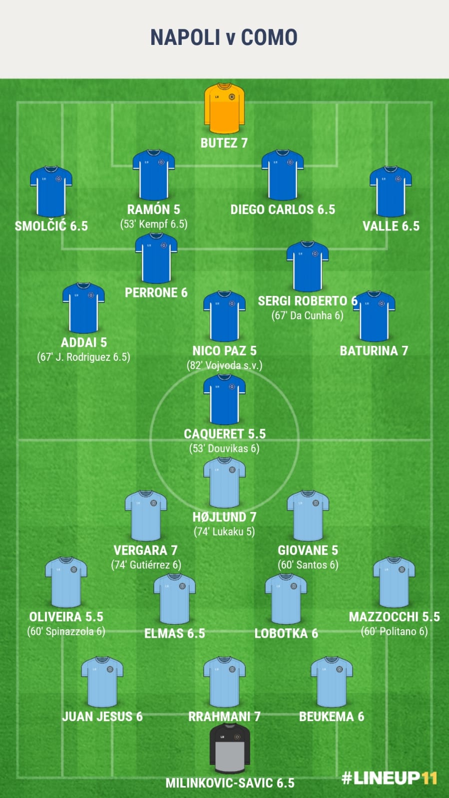 Una gara orientata all’equilibrio si sblocca solo con il penalty concesso al Como per intervento di Oliveira su Smolčić. Baturina non sbaglia dagli undici metri. All’inizio della ripresa, palla illuminante di Højlund oltre la linea difensiva dei comaschi: Vergara trova l’angolino e fa 1-1. Un’occasione per parte per evitare i rigori: prima il Napoli, con il colpo di testa di Rrahmani salvato da Nico Paz sulla linea. Poi, il Como con l’occasione di Vojvoda su cui salva Milinković-Savić. Ai penalty decisiva la parata di Butez su Lobotka all’ottavo turno di battuta.