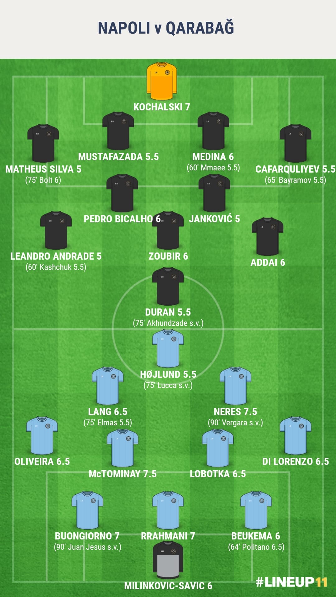 Neres 7.5: Dipinge nel cielo piovoso del Maradona una rovesciata che sapeva di magia. Pennella una traiettoria beffarda che si infrange sulla traversa. Resta un enigma per la retroguardia azera. Insomma: Qarabaggio! Perdonate la citazione poco colta…