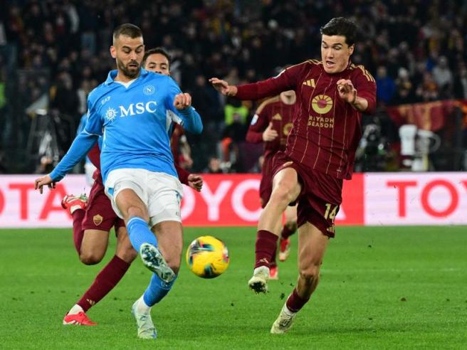 La prima occasione del match è a tinte azzurre con Svilar che diventa grande protagonista grazie ad un doppio intervento: prima ferma l’avanzata di Lang in uscita, poi neutralizza il pallonetto di Højlund. Qualche minuto dopo, Di Lorenzo chiude al volo sul traversone di Lang dando all’Olimpico l’illusione del gol azzurro. Minuto 35, il Napoli passa in vantaggio: Rrahmani vince il duello con Konè, innescando il contropiede con Neres e Højlund che dialogano in campo aperto. Il brasiliano non sbaglia davanti a Svilar. A metà di una placida seconda frazione di gioco, scambio di occasioni: prima Politano sfiora il raddoppio in contropiede, poi Pellegrini con un tiro dal limite non centra la porta. Allo scadere, un passaggio visionario di Dybala libera Baldanzi, che si lascia ipnotizzare da Milinković-Savić.