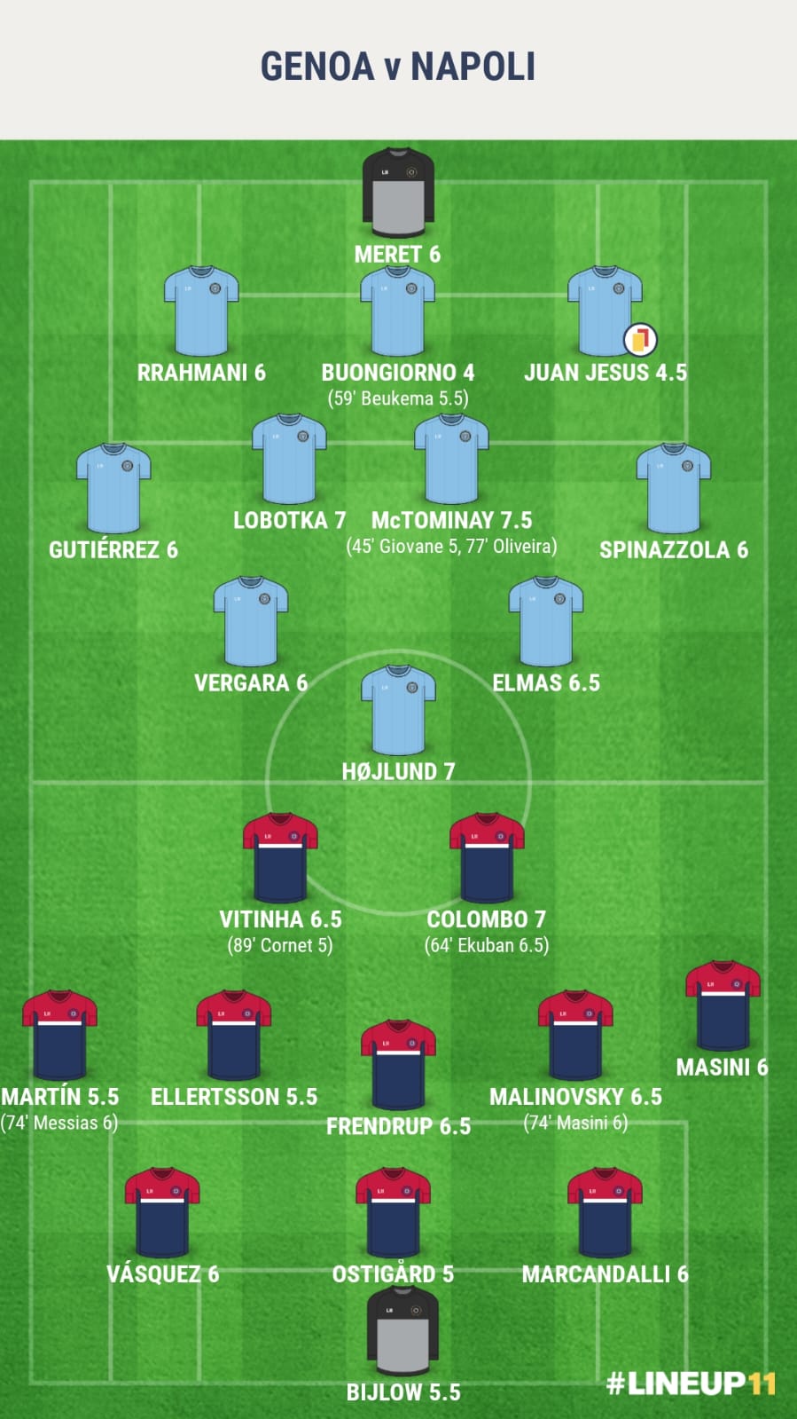 Un minuto di gioco e il Genoa è già avanti grazie al rigore trasformato da Malinovsky, concesso per il fallo di Meret su Vitinha. Il Napoli rimette il match in equilibrio con il tap-in vincente di Højlund (19′) sul tiro di McTominay. Due minuti dopo, lo scozzese si mette in proprio: salta Malinovsky e tira da lontanissimo all’angolino. È 1-2 per i partenopei! Malinovsky prova ad imitarlo, ma Meret si oppone. All’alba della ripresa, Colombo strappa palla a Buongiorno e va a rete per il pari del Grifone. Fino al 90′, da annoverare solo una conclusione murata di Gutiérrez. Al 94′, Højlund non sbaglia il penalty decisivo concesso per fallo di Cornet su Vergara: è 2-3!